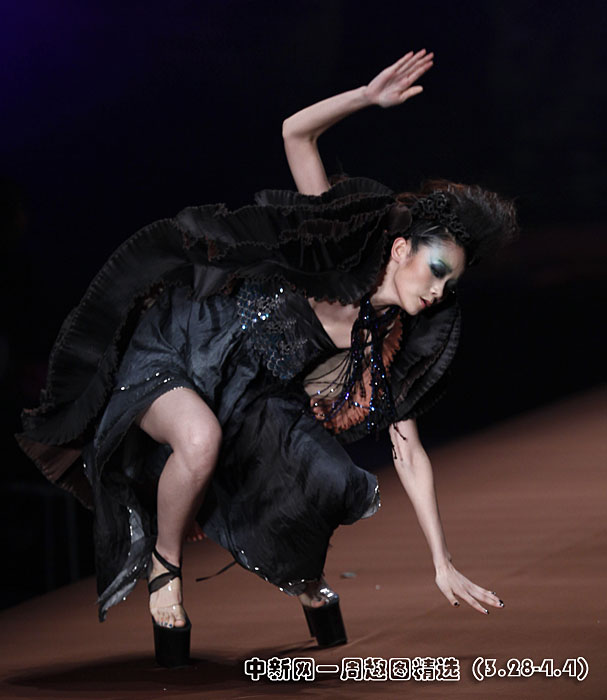 3月29日晚,旭化成·中国时装设计师创意大奖张义超作品发布会在北京举行,一名模特在T型台上“失足”摔倒。图片来源:中国新闻网>>点击观看详细内容