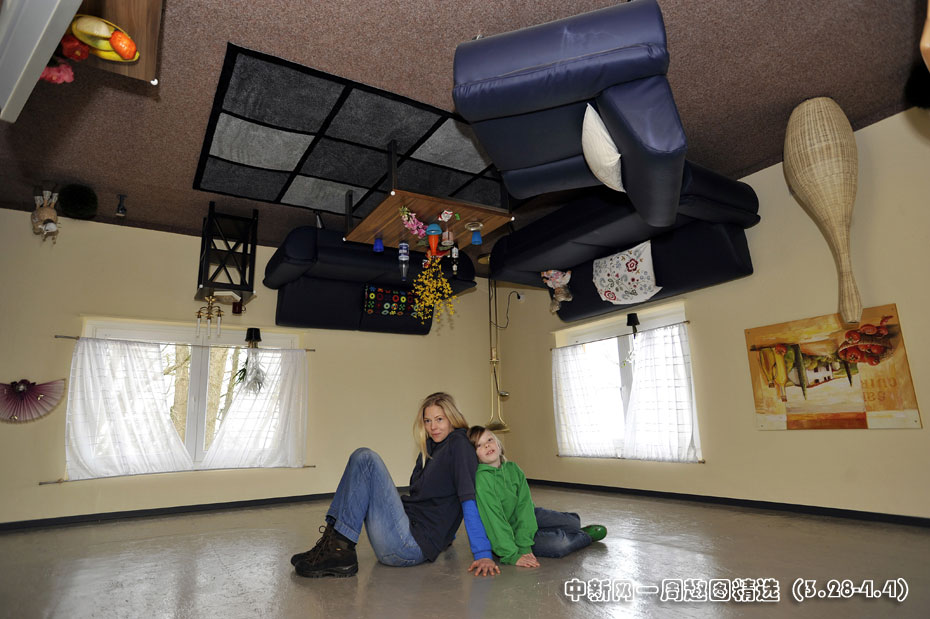 3月30日,德国盖托夫市“疯狂的房子”面向公众开放。该房屋整个颠倒里面的家具也是被钉在屋顶上的。图片来源:中国新闻网>>点击观看详细内容