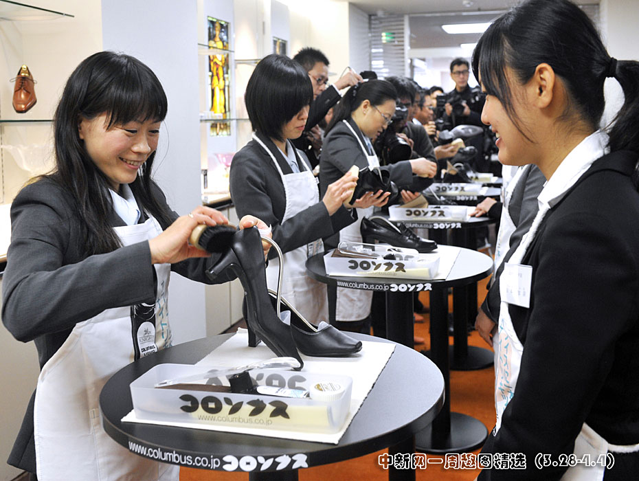 4月1日,日本一家鞋油厂新员工在入职仪式上为老员工擦鞋。图片来源:中国新闻网>>点击观看详细内容