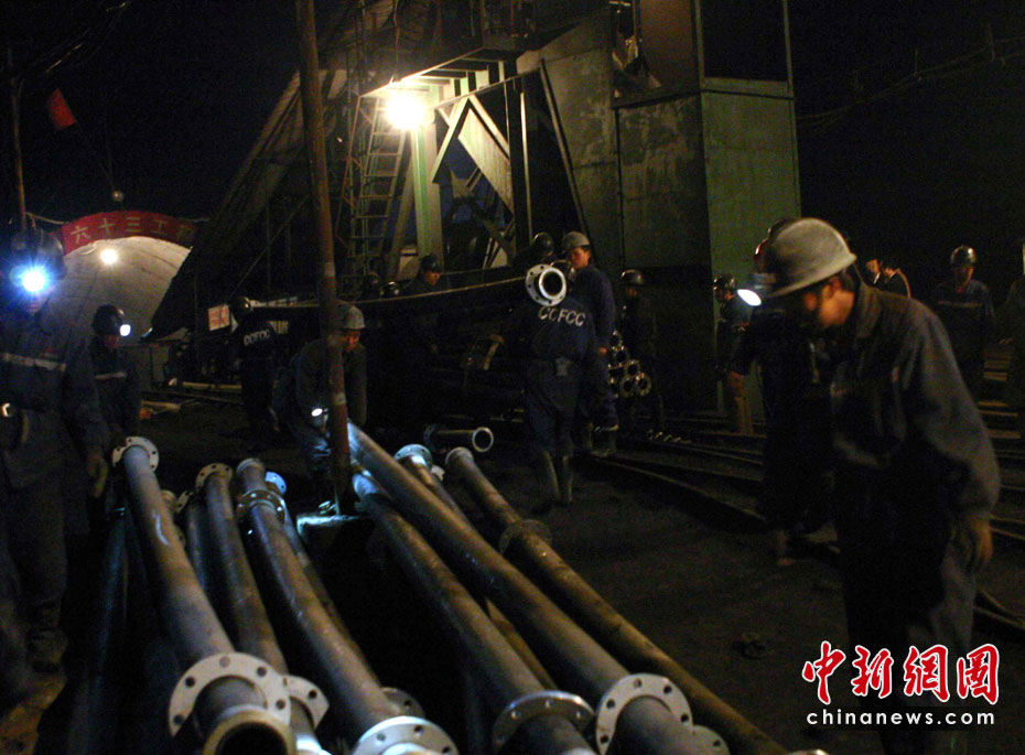 28日下午,华晋焦煤有限责任公司王家岭煤矿发生透水事故。经核查,初步确认事故发生时当班下井261人,升井108人,有153人被困井下。图为矿工在井下运送抢险设备。中新社发 张云 摄
