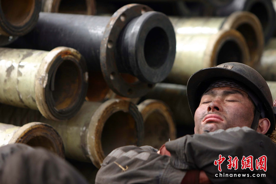 3月30日,“3·28”山西王家岭煤矿透水事故抢险工作仍在进行。矿山救护队与矿工们为加快排水进度,夜以继日地工作,不断增添新的排水管道以便尽快救出井下被困矿工。图为疲惫的救援人员正在小憩。中新社发 张云 摄