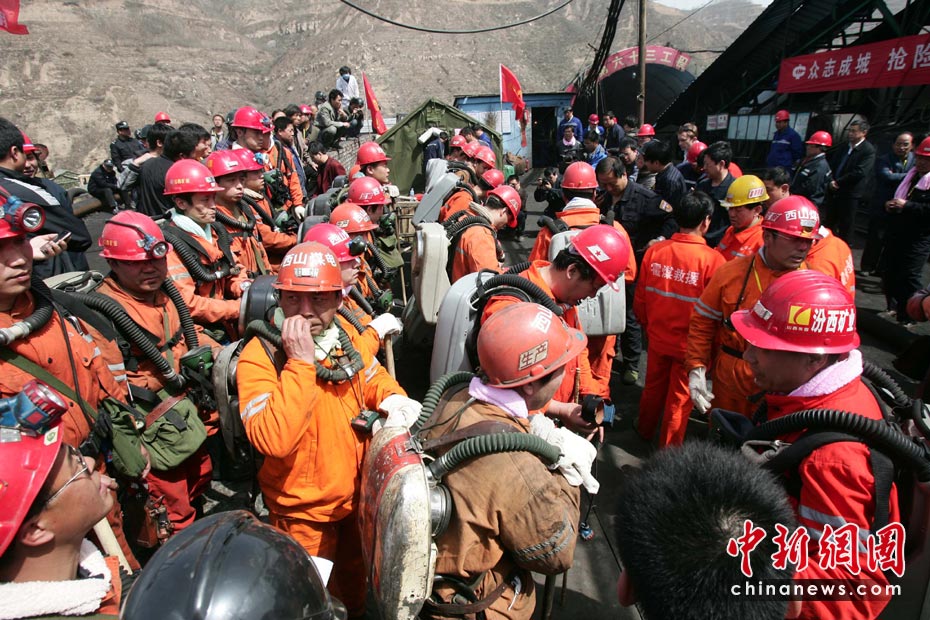 4月4日,华晋焦煤公司王家岭矿透水事故第八天,抢险指挥部成三个搜救小分队下井搜救井下被困矿工,与他们一同下井还有6名潜水员。中新社发 张云 摄