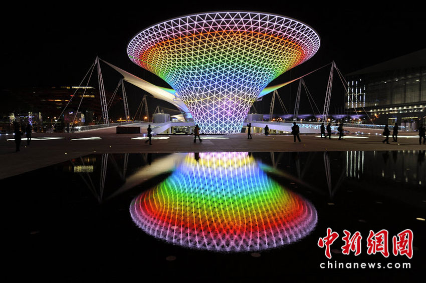 4月8日,上海世博会园区各大洲国家展馆的建设和布展绝大多数已经进入尾声。图为世博轴太阳谷在水中的夜景。梁臻 摄