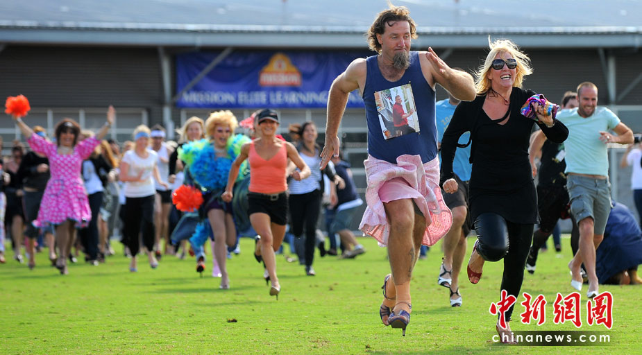 4月10日,在澳大利亚墨尔本,人们穿着高跟鞋赛跑。旨在挑战多人穿高跟鞋赛跑的吉尼斯世界纪录。尽管最终挑战失败,参赛者仍在80米的赛道上争先恐后,各显神通。