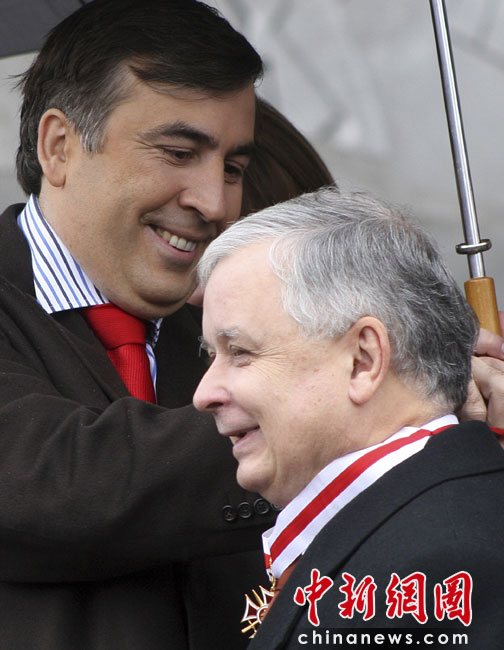 波兰总统卡钦斯基乘坐的一架图-154飞机10日在俄罗斯斯摩棱斯克州北部一军用机场降落时失事,至少87人死亡。卡钦斯基本人被确认身亡。图为2007年波兰总统卡钦斯基与格鲁吉亚总统米哈伊尔萨卡什维利。
