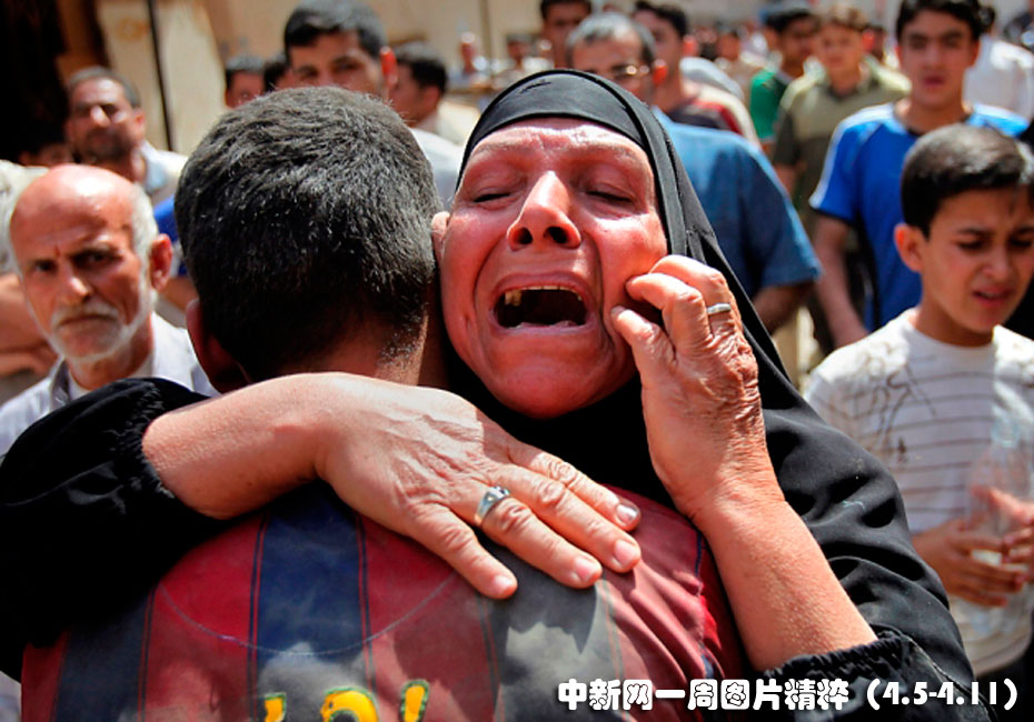 4月6日周二,一名女子在巴格达市中心的爆炸现场放声痛哭。全城至少有五枚安放在公寓楼中的炸弹爆炸,还有一个市场也受到了炸弹的袭击。