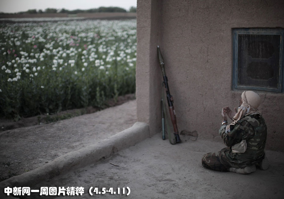 4月5日周一,在阿富汗南部赫尔曼德省马尔贾地区的一处塔利班据点,一名与未摄入镜头的美国海军陆战队士兵徒步巡逻的阿富汗国家安全部队战士正在进行祷告,他的面前是一大片盛开的罂粟花。