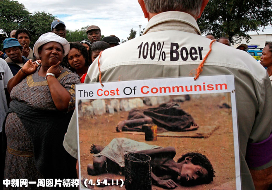 4月6日周二,在南非小镇文特斯多,被害“白人至上”领导人尤金•特雷布兰奇的一名支持者(图右,背对镜头者)站在法院门外对人群讲话。