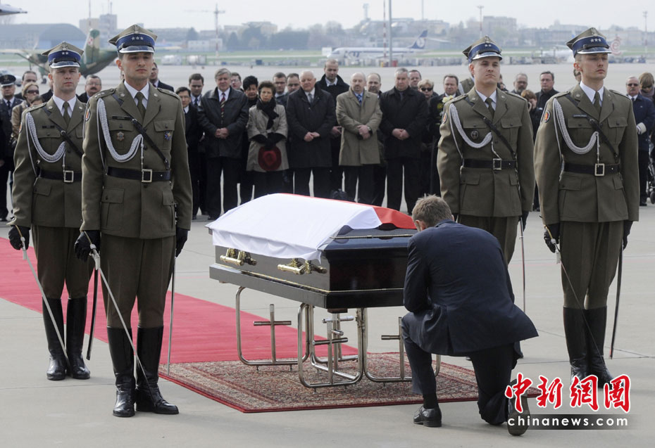 4月10日,卡钦斯基乘坐专机从华沙飞往俄罗斯斯摩棱斯克市,参加卡廷森林事件70周年纪念活动。途中飞机在斯摩棱斯克“北方”军用机场附近降落时失事,共造成包括卡钦斯基夫妇及众多政府高官在内的96人死亡。惨剧发生后,举世震惊。图为波兰总理图斯克在卡钦斯基遗体前跪拜。