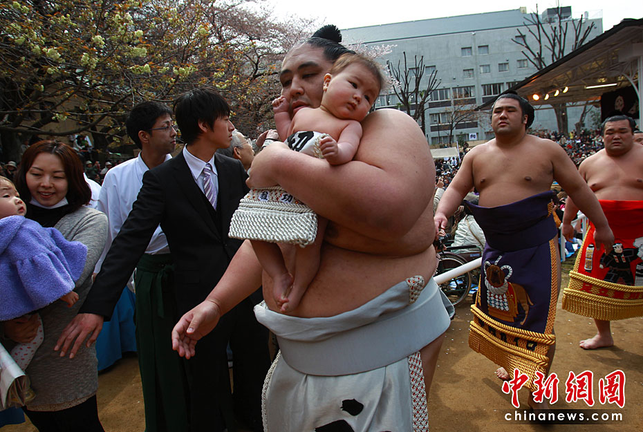 4月9日,来自世界各地的相扑选手齐聚日本东京靖国神社内的相扑馆参加为期一天的日本供奉大相扑比赛。图片来源:中国新闻网