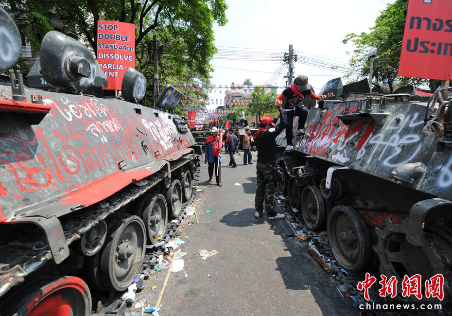 当地时间4月12日,泰国红衫军在曼谷市区抬着棺材举行游行,借此向政府施压促阿披实下台。此前红衫军示威者与军警发生冲突,造成21人死亡。图片来源:中国新闻网