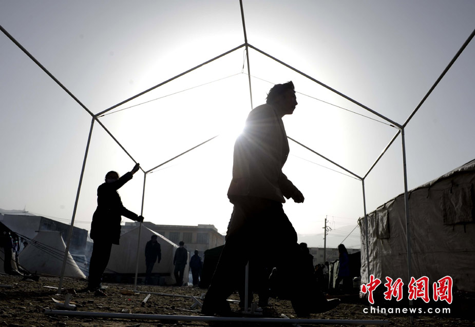 4月15日,青海玉树县体育场的地震灾民安置点内,玉树地震灾民正在积极自建抗震帐棚。中新社发 廖攀 摄
