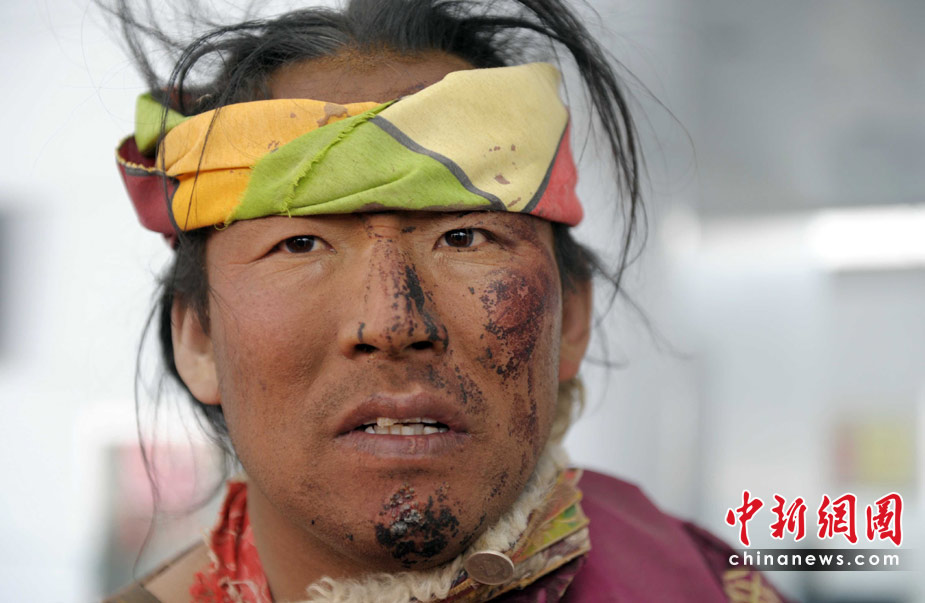 4月15日下午,云南边防总队医疗救援队刚下飞机立即投入伤员转移工作,官兵们在玉树机场从救护车上抬下地震伤员,进行转移安置和治疗。中新社发 陈文 摄