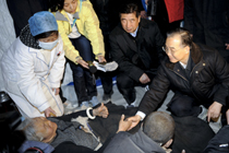 一架载有青海玉树地震首批伤员及伤员家属的中国空军运输机抵达成都双流国际机场,其中35名地震伤员将被分别送往四川省人民医院和四川大学华西医院进行治疗,运输机于15日下午15时30分从玉树当地机场起飞,经过1小时30分的飞行,历程800公里,于4月15日下午17时03分,顺利抵达成都。图为医院抢救人员正将受伤小孩从飞机抱往救护车。中新社发 张浪 摄