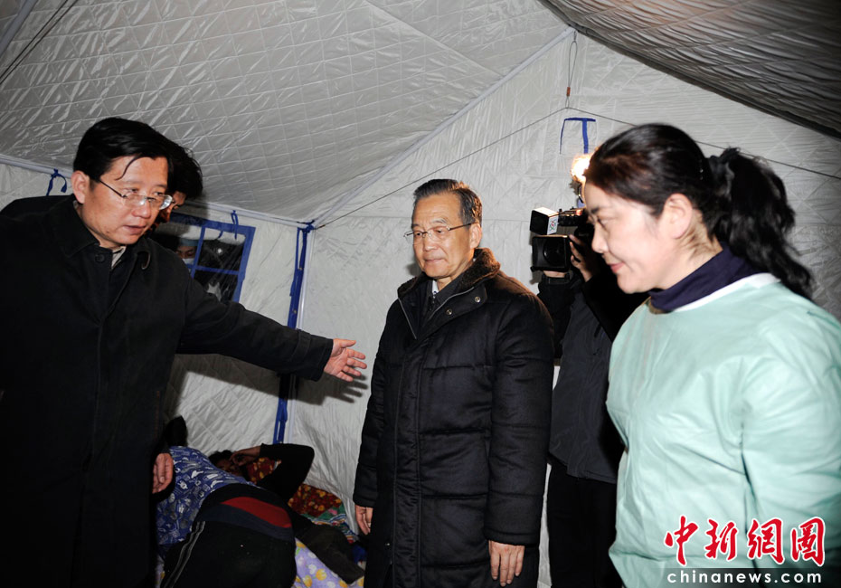 4月15日20时,中国国务院总理温家宝来到青海省玉树县玉树自治州医院看望受灾民众。温总理看望完受灾民众后表情凝重。中新社发 廖攀 摄