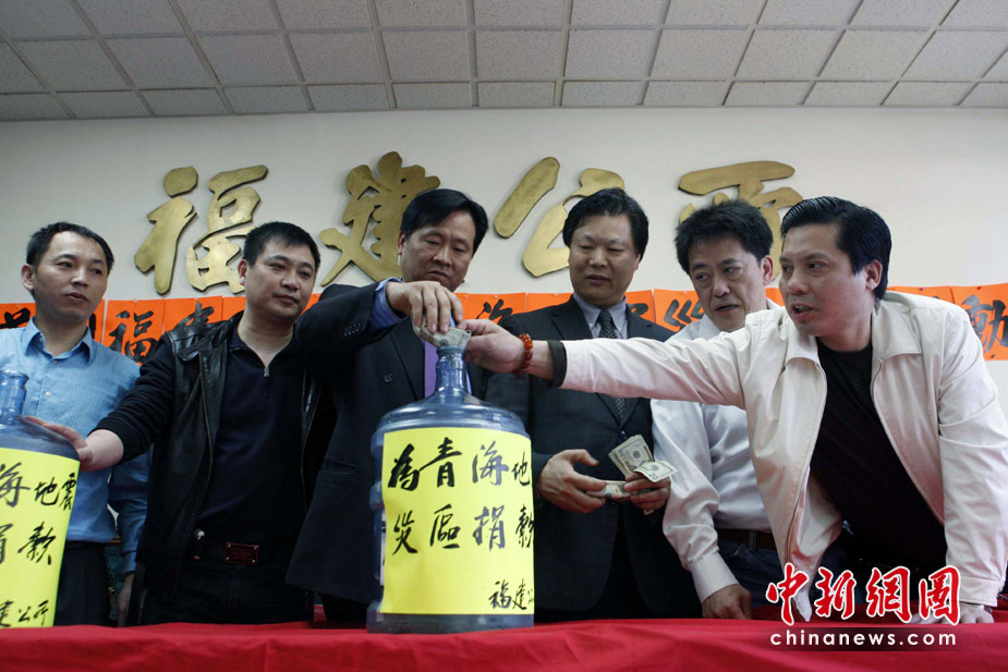 青海玉树发生地震以来,美国各地的华人华侨齐伸援手,纽约的华人社团联合总会15日呼吁下属数百社团为玉树灾区捐款,并在华埠主要街道沿街设立捐款箱。图为纽约福建公所捐款现场,华人华侨们在不到几分钟的时间内,就为青海玉树灾区捐款近5000美元。中新社发 魏晞 摄