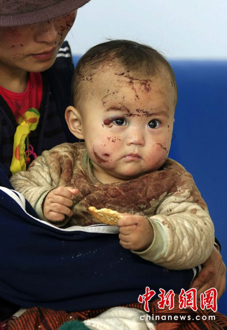 图为4月15日,青海玉树巴塘机场,受伤的孩子等待转运至西宁等地治疗。青友 摄
