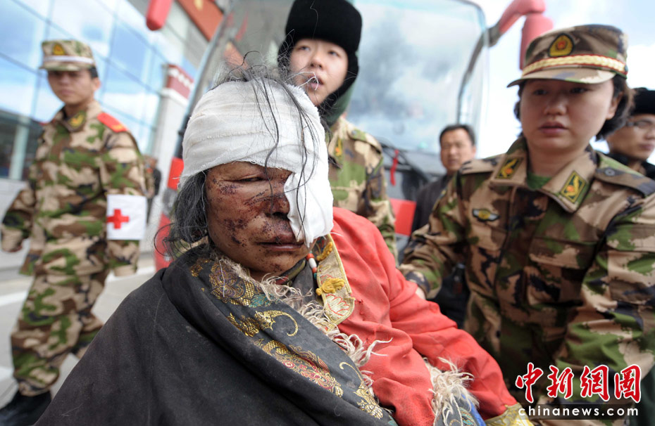 图为4月15日下午,玉树地震重伤员用各种交通工具送达机场,广东边防总队医疗救援队,用被褥接转伤员。中新社发 陈文 摄