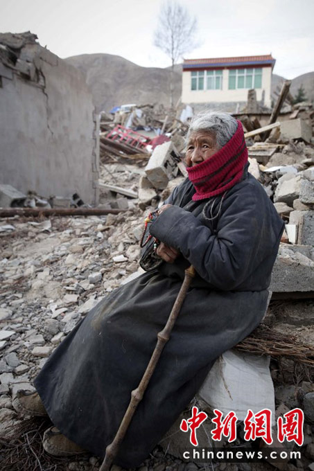 图为4月15日,青海玉树,新建路,84岁的老奶奶卓玛坐在家门口,她说她46岁的女儿已经在地震中遇难了。(CFP 图)