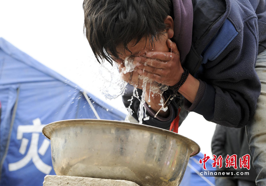 4月16日,青海玉树体育场地震受灾民众安置点,一位居民用清水洗脸。随着救灾物资的到位,受灾民众生活得到基本保障。 中新社发 廖攀 摄