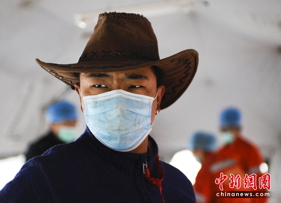 4月16日,青海玉树体育场武警医院医疗队帐篷里,一名戴着红丝带的志愿者帮助医务人员展开救援。 中新社发 廖攀 摄