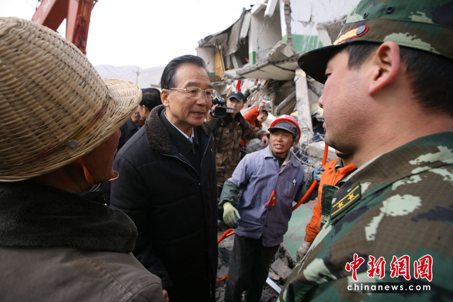 2010年4月16日10时许,中国国务院总理温家宝来到青海省玉树藏族自治州玉树县地震灾区四川消防部队玉树教育局救援现场了解情况。4月14日07时49分许,青海省玉树藏族自治州玉树县(北纬33.1,东经96.7)发生7.1级地震。中新社发 刘忠俊 摄