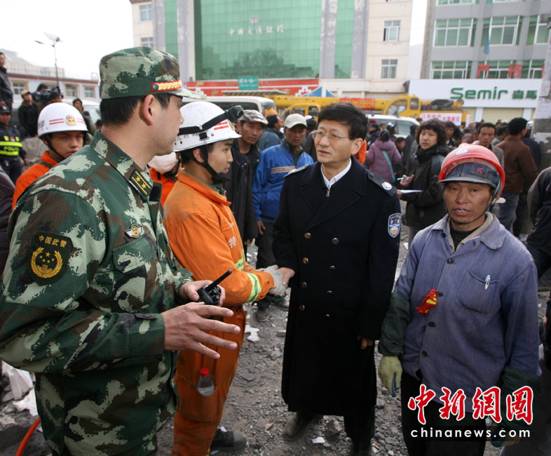 2010年4月16日10时许,国务委员、公安部部长孟建柱来到青海省玉树藏族自治州玉树县地震灾区四川消防部队玉树教育局救援现场,询问救援情况,并看望慰问消防官兵。4月14日07时49分许,青海省玉树藏族自治州玉树县(北纬33.1,东经96.7)发生7.1级地震。中新社发 刘忠俊 摄