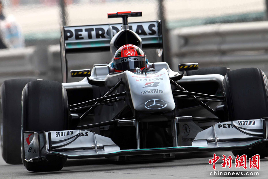 4月16日,2010国际汽联F1世界锦标赛上海站在上海国际赛车场开始车手第一、第二次练习赛。图为代表梅赛德斯GP车队出战的老车王、德国车手舒马赫重回上海赛道。 中新社记者 任晨鸣 摄