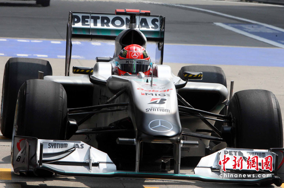 4月16日,2010国际汽联F1世界锦标赛上海站在上海国际赛车场开始车手第一、第二次练习赛。图为代表梅赛德斯GP车队出战的老车王、德国车手舒马赫重回上海赛道。 中新社记者 任晨鸣 摄