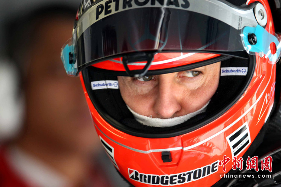 4月16日,2010国际汽联F1世界锦标赛上海站在上海国际赛车场开始车手第一、第二次练习赛。图为代表梅赛德斯GP车队出战的老车王、德国车手舒马赫重回上海赛道。 中新社记者 任晨鸣 摄