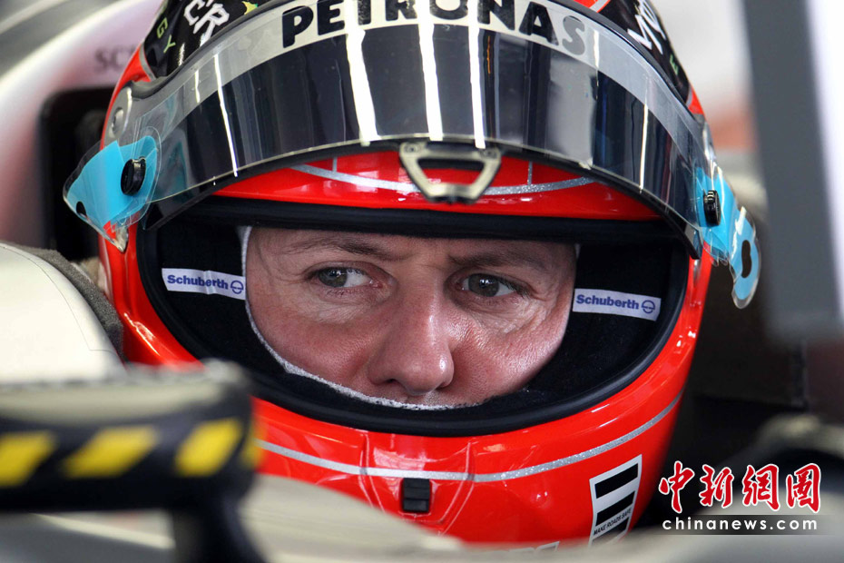 4月16日,2010国际汽联F1世界锦标赛上海站在上海国际赛车场开始车手第一、第二次练习赛。图为代表梅赛德斯GP车队出战的老车王、德国车手舒马赫重回上海赛道。 中新社记者 任晨鸣 摄