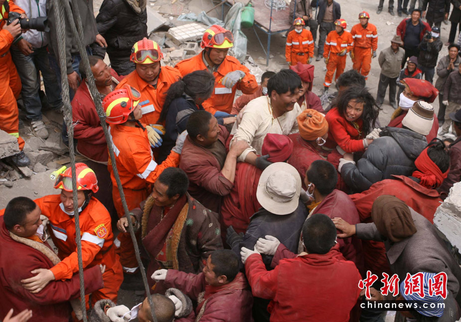 2010年4月16日13:50分左右,青海省玉树藏族自治州玉树县地震发生第三天,在中心城区一垮塌宾馆现场一名被埋54小时13岁的才珍拉姆被国家地震局应急救援队等成功救出。4月14日07时49分许,青海省玉树藏族自治州玉树县(北纬33.1,东经96.7)发生7.1级地震。中新社发 刘忠俊 摄