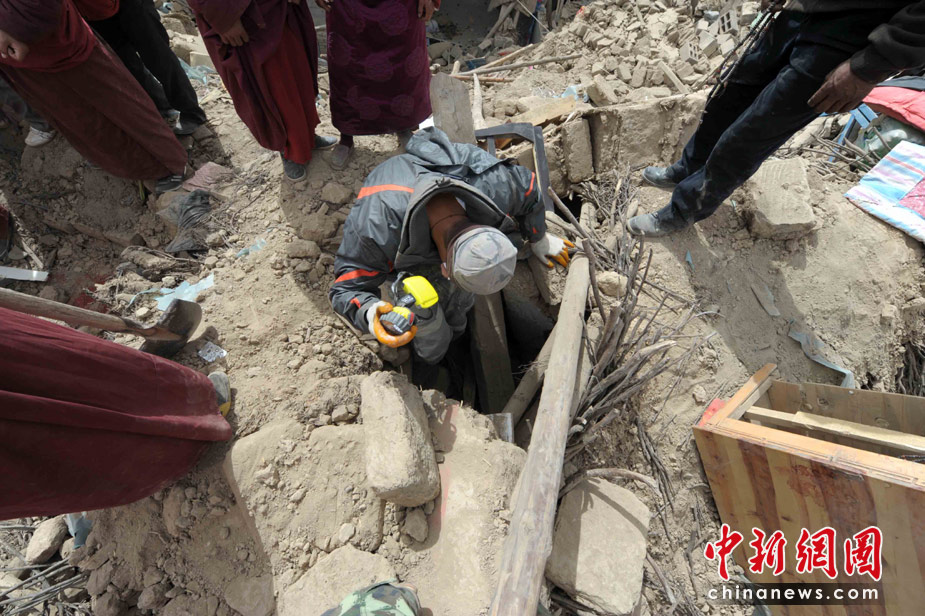 4月16日,青海玉树地震救援进入第三天,来自兰州军区、山东消防特勤、重庆特勤、广东边防总队、云南边防总队、青海民兵等搜救队连续搜救,幸存者奇迹生还。中新社发 陈文 摄