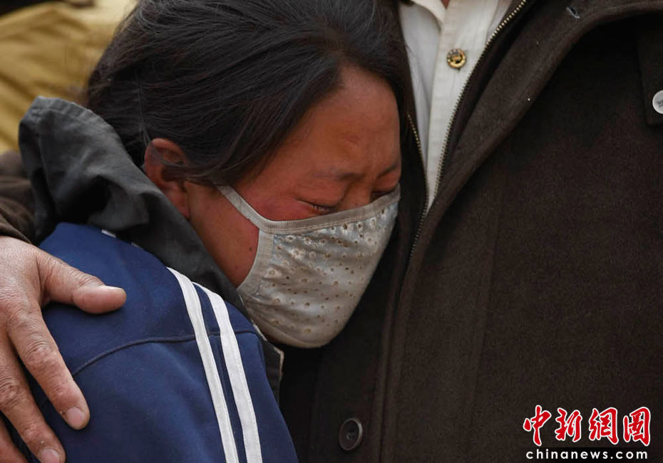 2010年4月16日,青海玉树藏族自治州玉树县结古镇一所中学的震灾救援现场,痛失孩子的母亲泪流不止。中新社发 盛佳鹏 摄