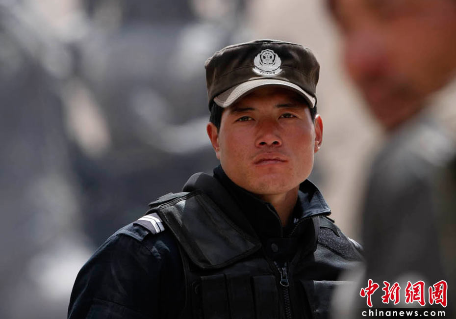 2010年4月16日,青海玉树藏族自治州玉树县结古镇格萨尔王广场,一名警察正在执勤。中新社发 盛佳鹏 摄