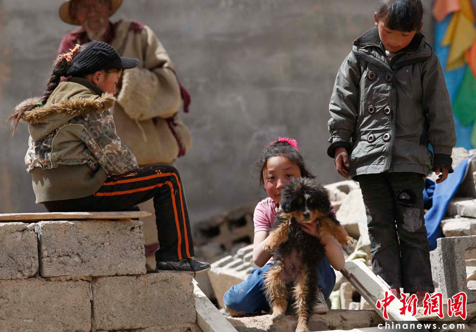 2010年4月16日,青海玉树藏族自治州玉树县结古镇,两名儿童在地震的废墟上与小狗玩耍。中新社发 盛佳鹏 摄