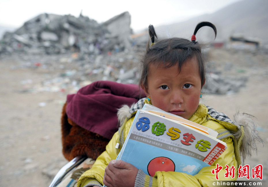 4月17日,一位上小学二年级的女童紧抱着自己的课本,站在震后的废墟前。4月17日上午,青海省民政厅厅长更阳向媒体发布了一系列安抚救济措施,灾民生活补助按每人每天15元,每一个死亡人员家庭补助8000元,“三孤”指孤老、孤残、孤儿补助每人每月1000元,孤儿补助到18岁止。中新社发 陈文 摄