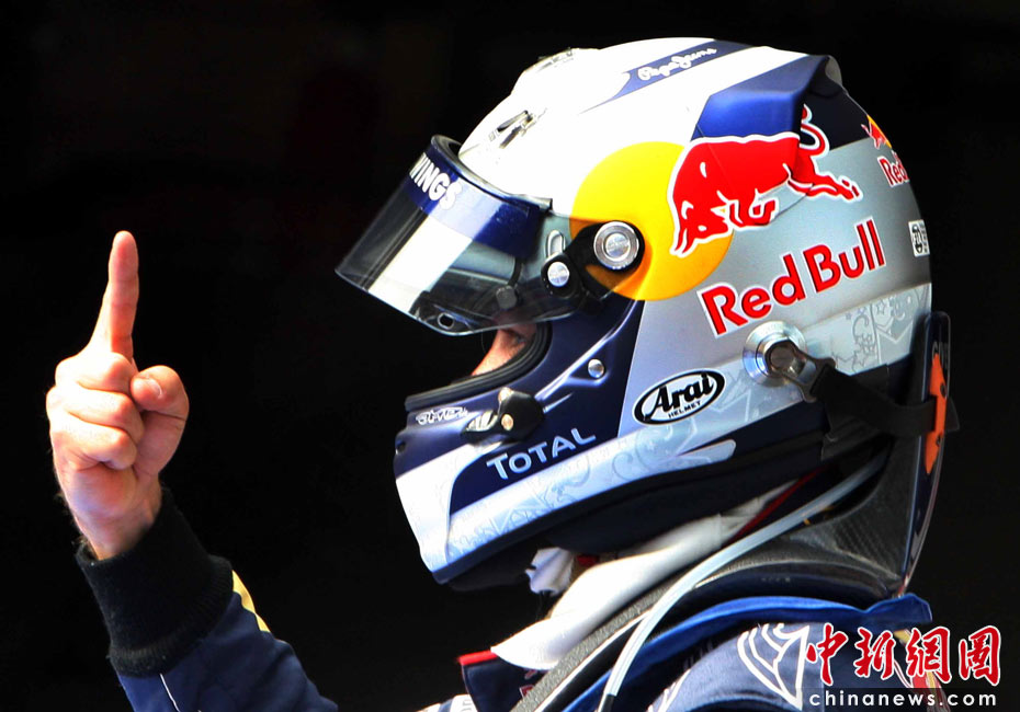 4月17日下午,2010国际汽联F1世界锦标赛上海站在上海国际赛车场举行排位赛,代表红牛车队出战的德国车手维特尔获得杆位,队友、澳大利亚车手韦伯获得第二名,法拉利车队的西班牙车手阿隆索获得第三名。中新社记者 任晨鸣 摄