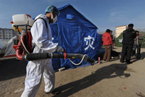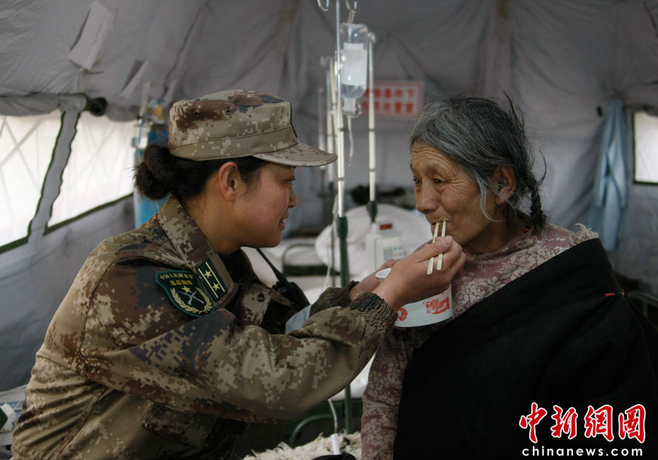 总后青藏兵站部抗震救灾医疗队目前在玉树灾区开展救治工作,已收治重症伤病员48名,实施手术9例。医疗队到达玉树结古镇后,迅速设立野战医院,展开救治工作。在得知西同路附近还有大批伤员急需救治后,又迅速派出救护车进行就诊。图为医疗人员精心护理伤员。中新社发 邹小庆 摄