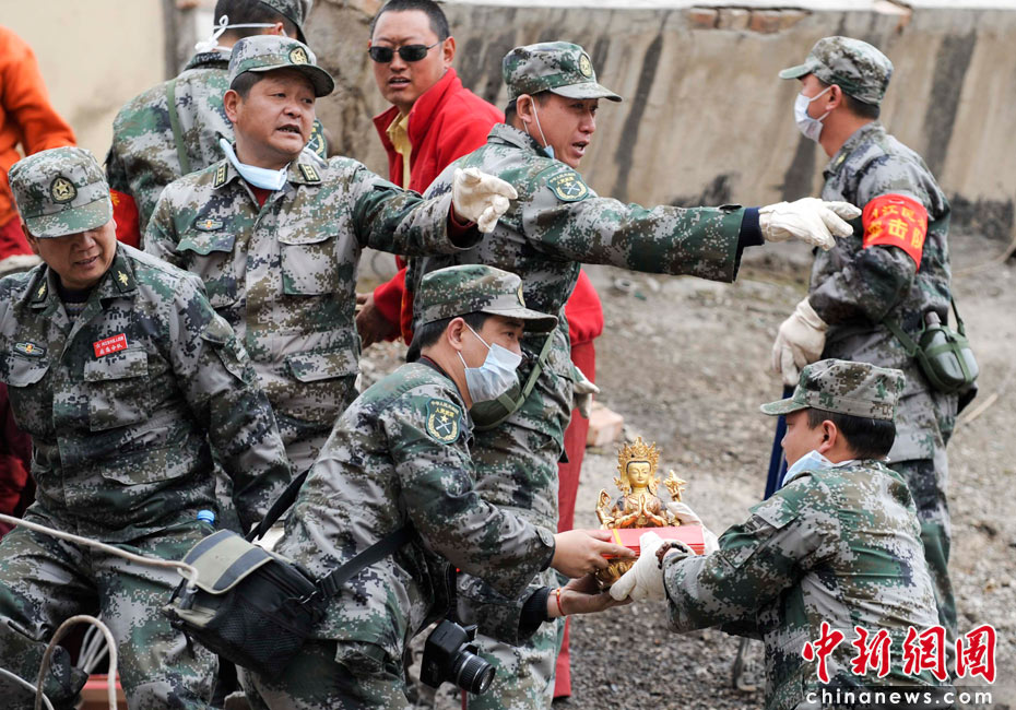 4月17日,青海玉树结古镇民主路,解放军战士为信众清理废墟中的法器。中新社发 廖攀 摄