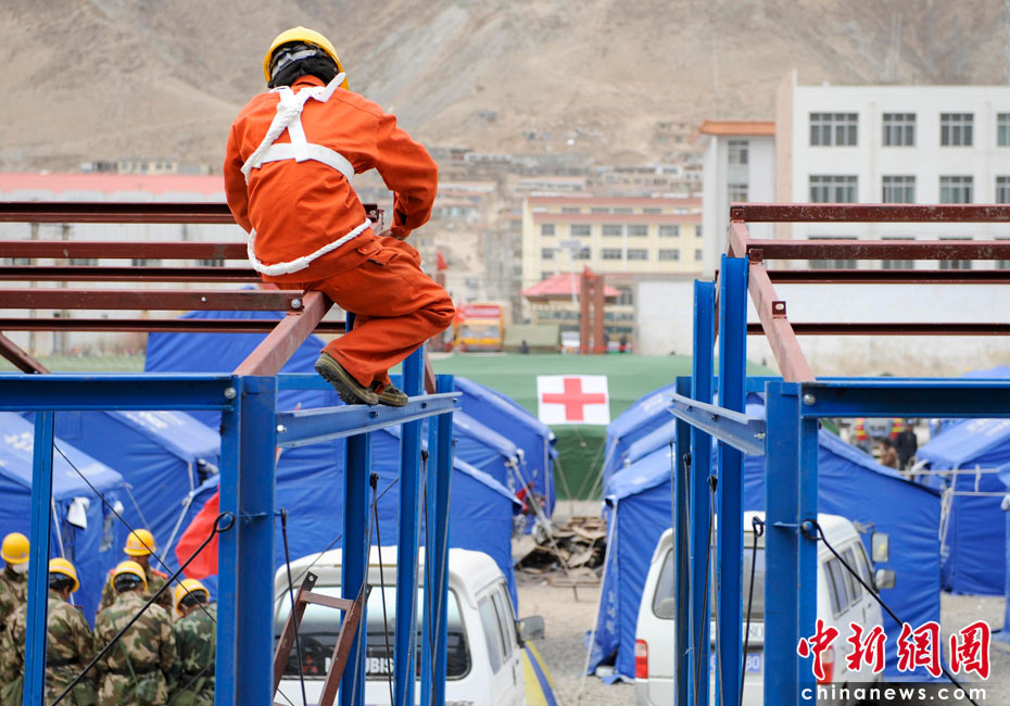 4月17日,青海玉树体育场受灾民众安置点,工人们安装临时板房。中新社发 廖攀 摄