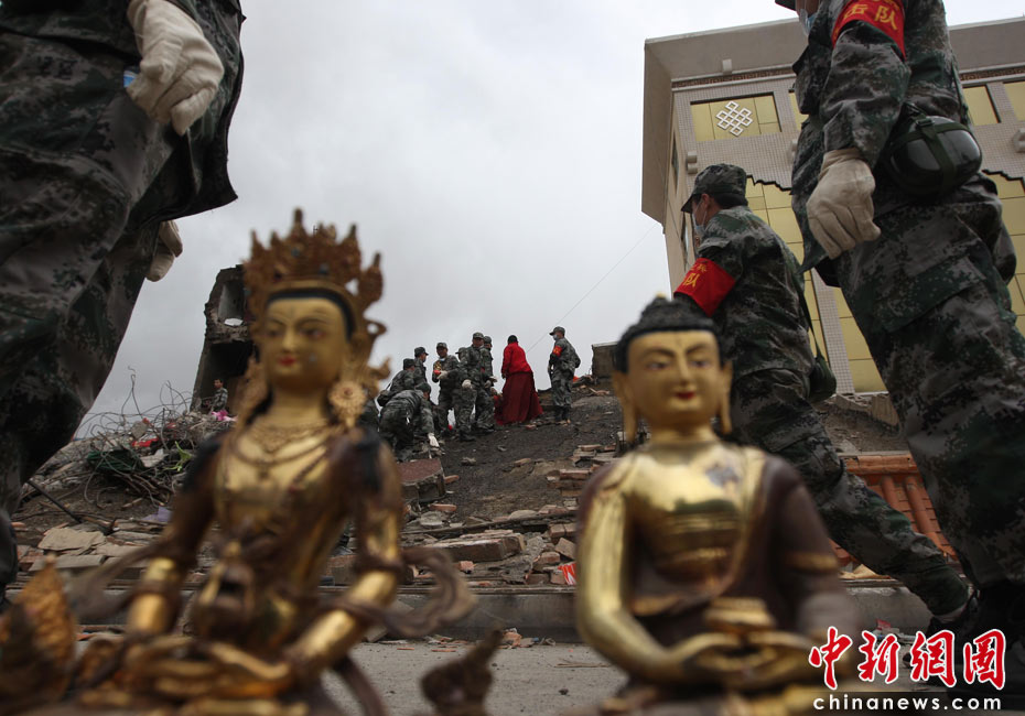 4月17日,青海玉树结古镇民主路,解放军救援队为受灾民众从房屋废墟内搜索出多件法器。中新社发 盛佳鹏 摄