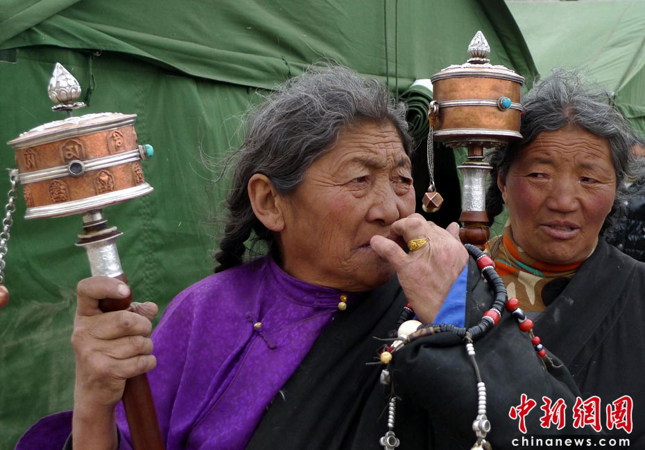 4月17日傍晚,玉树震区街头,两位藏民转经祈福。中新社发 孙自法 摄