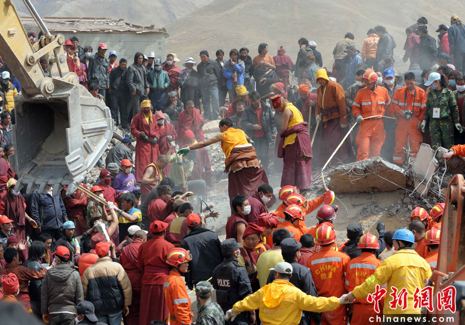4月17日,中国地震救援队、四川救援队在玉树结古镇三岔路城建一号商铺展开搜救,救援队员、僧人、志愿者等在同一搜救点连续奋战。中新社发 陈文 摄