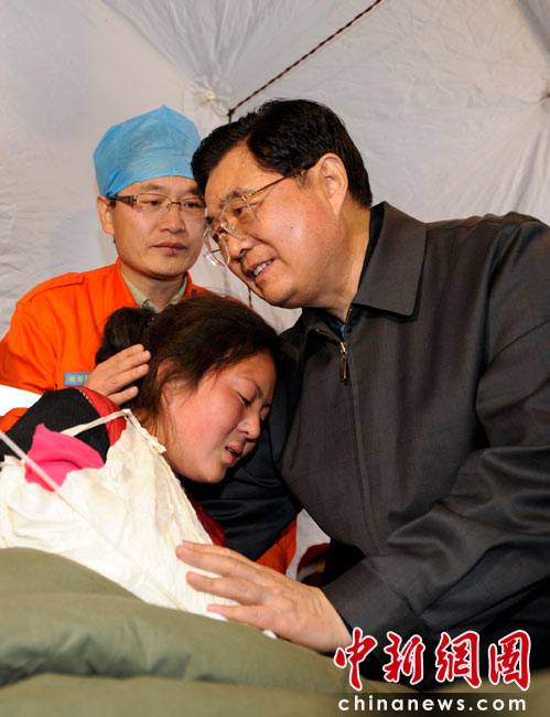 4月18日,中共中央总书记、国家主席、中央军委主席胡锦涛来到青海玉树体育场地震灾民安置点看望受灾民众和医务人员。中新社发 廖攀 摄