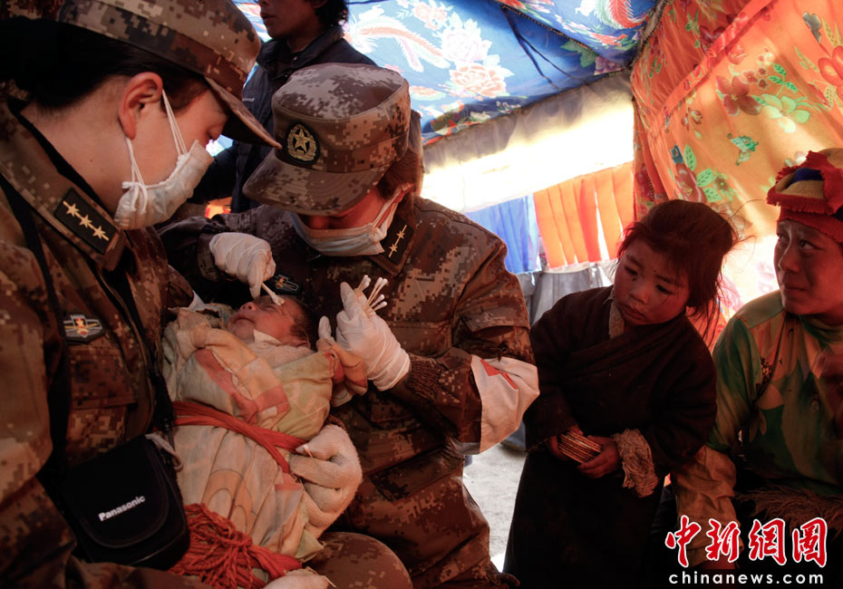4月18日,总后青藏兵站部抗震医疗队在青海玉树震中结古镇展开救援的同时,还派员向周边牧区巡诊,救治伤病员。图为医务人员为黄林格头牧区索南求几的婴儿进行检查和护理。据悉,这个牧区所有房屋在地震中被损毁,不少牧民在地震中受伤,目前住在搭建的帐篷里。中新社发 邹小庆 摄