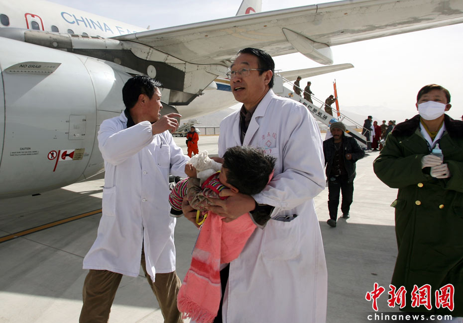 4月18日,青海省第五人民医院院长吴天俊等在玉树机场抢运受伤婴儿。中新社发 苏丹 摄