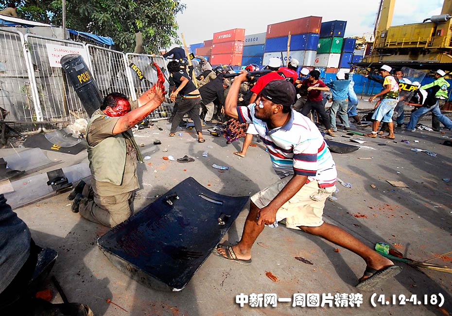 4月14日周三,在印度尼西亚首都雅加达,一名示威者在冲突中殴打一名警员。示威者手持砍刀和棍棒,抗议政府试图拆除一名18世纪阿拉伯伊斯兰传教士的坟墓。