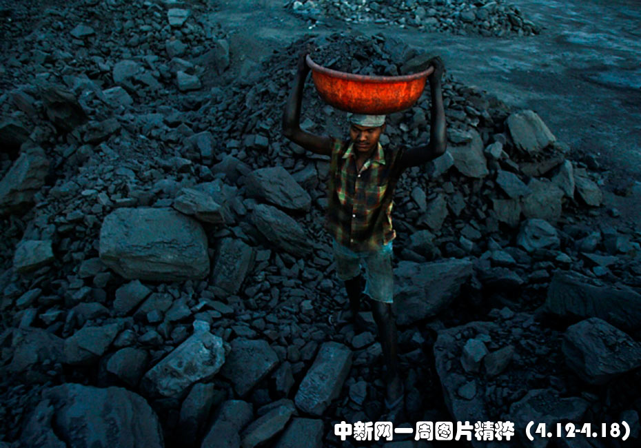 4月12日周一,在印度奥里萨邦的一座煤矿附近,一名工人正在搬运煤炭。