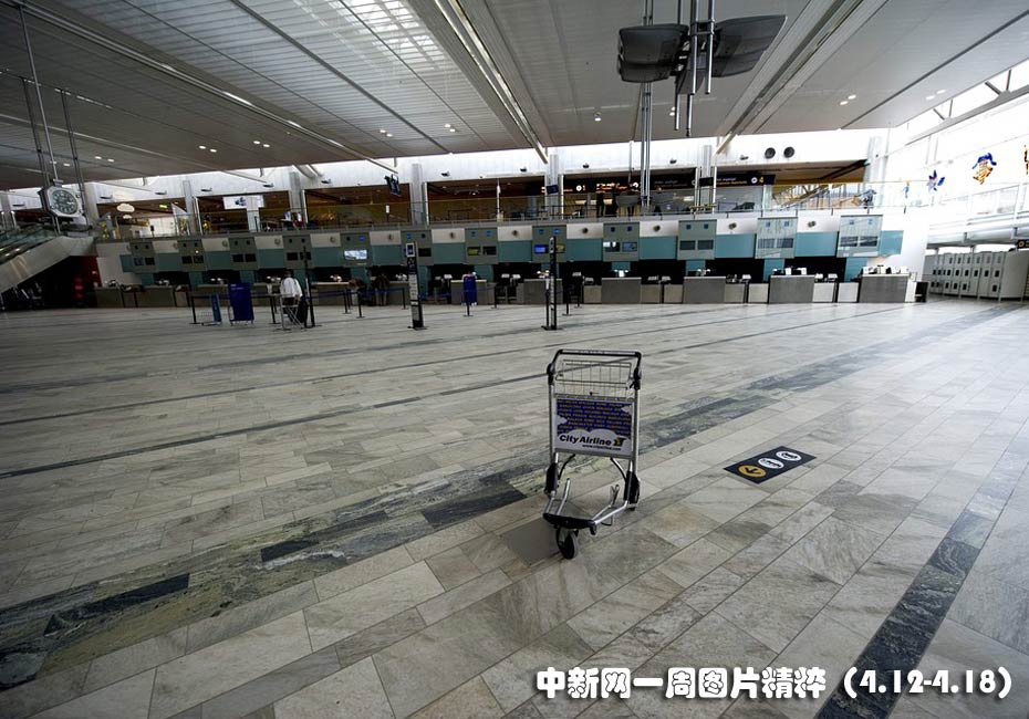 瑞典一机场大厅办理登机手续的窗口前空无一人,此前冰岛火山喷发产生的火山灰导致欧洲多个机场被迫关闭。